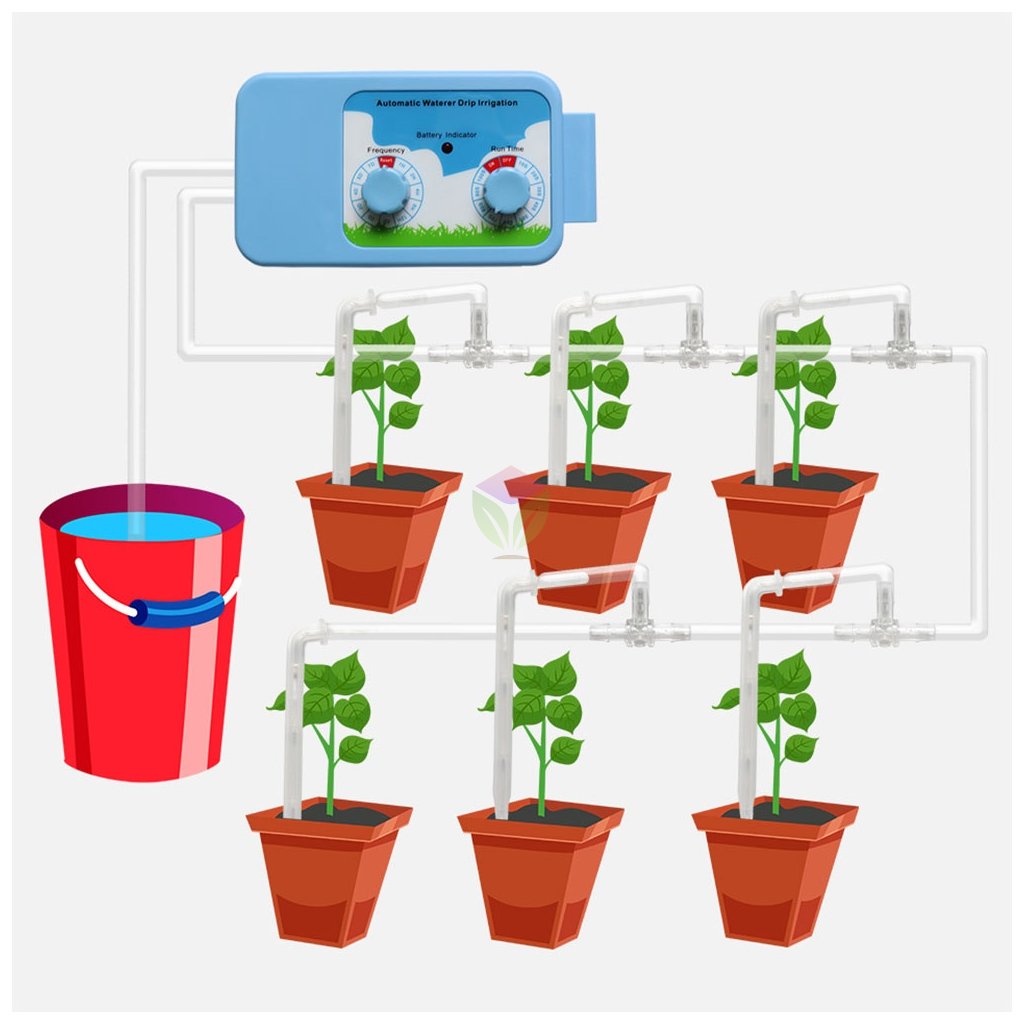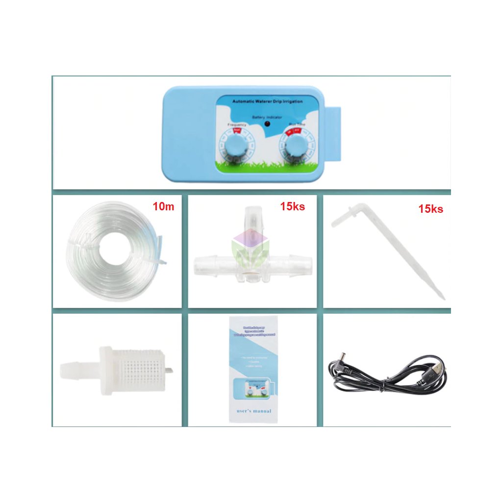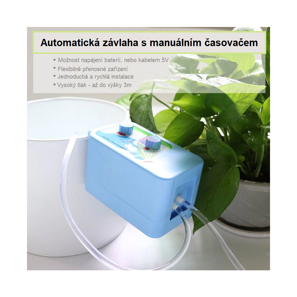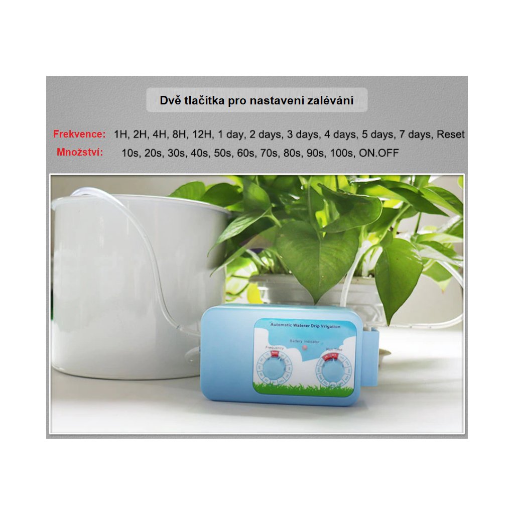 Automatická závlaha je určená pro zalévání až 12 květináčů. Manuálně nastavitelný program jak často a kolik zálivky má zařízení přečerpávat do Vašich květináčů. Vše je velmi jednoduché pro začátečníky a uživatele bez zkušeností s automatickými systémy. Zařízení pro automatické zalévání má pouze dva kniply, jedním nastavíte frekvenci zalévání a tím druhým čas jak dlouho má čerpat vodu z nádrže k rostlinám.