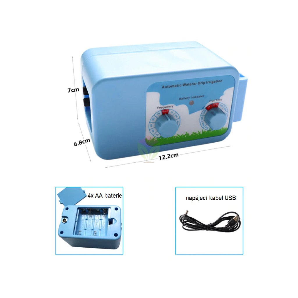 Zařízení pro zalévání můžete napájet čtyřmi AA bateriemi, nebo adaptérem například od telefonu, který má výstupní napětí 5V - USB kabel je součástí balení.