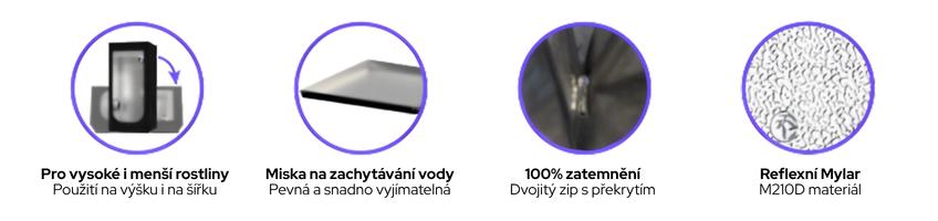 Prostorný a odolný pěstební stan, který poskytuje maximální kontrolu nad prostředím a dostatek místa pro efektivní práci se světlem, ventilací i samotnými rostlinami.