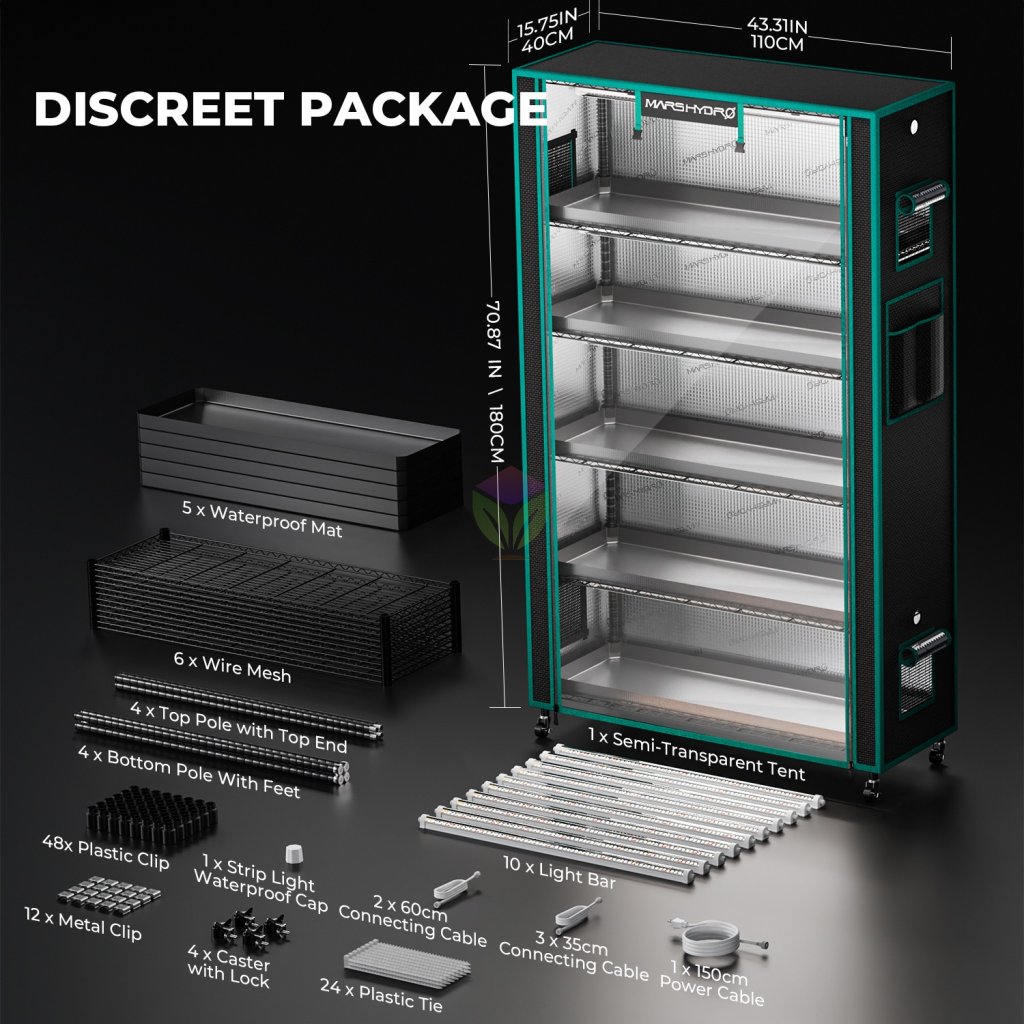 - All-in-One Controlled Environment: Kovový rám a uzavřený stan udržují stabilní vlhkost a teplotu, zatímco full-spectrum LED světla simulují přirozené sluneční světlo, což eliminuje vliv počasí a ročních období.