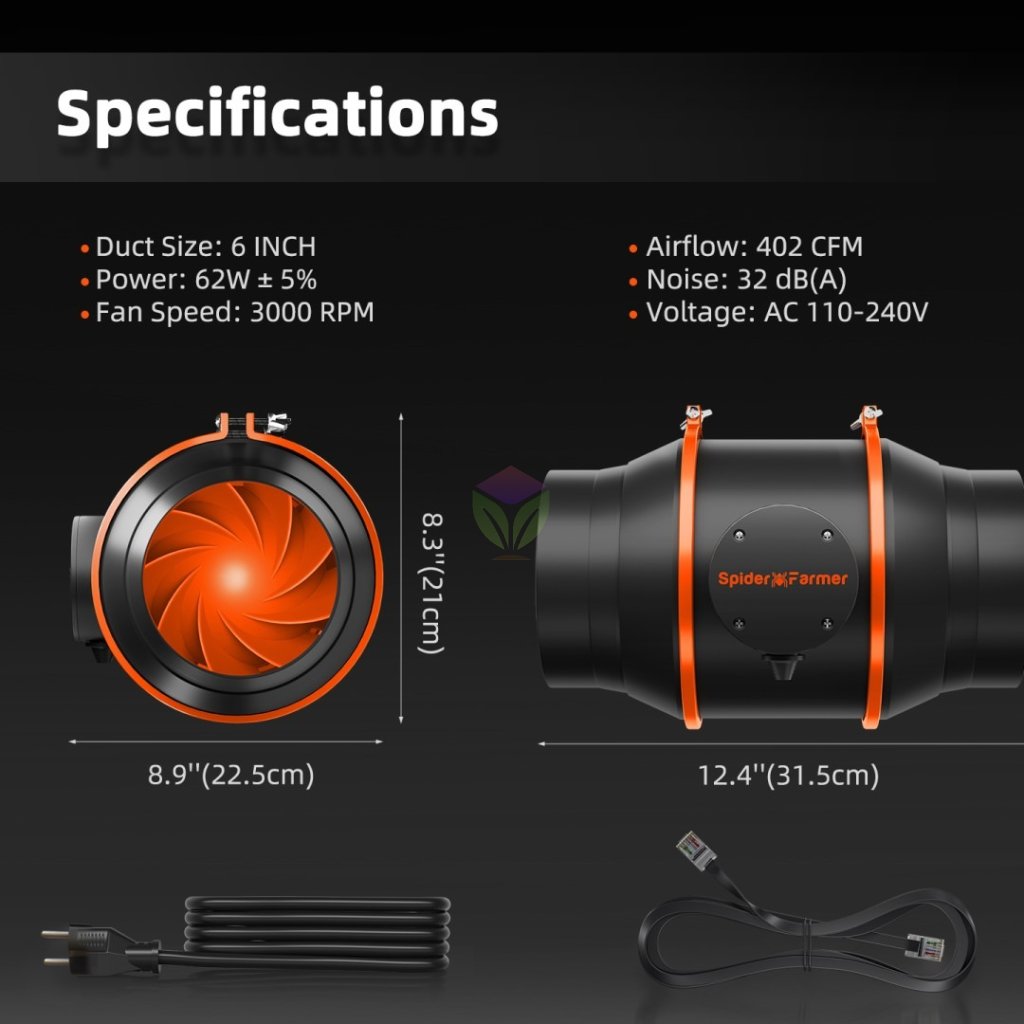 Ventilátor účinně odstraní nežádoucí pachy, což je ideální pro použití v pěstebních stanech nebo v uzavřených pěstebních oblastech. Uhlíkové filtry čistí a odfiltrují plísně, spory, prach, pyl, pachy a další škodlivé částice. Regulátor teploty a vlhkosti automatizuje proudění vzduchu a udržuje optimální podmínky růstu pro lepší výnosy a zdravější rostliny. Vyznačuje se designem s portem RJ12 a změnou na sady ovladačů GGS. Úpravy lze provádět prostřednictvím aplikace Spider Farmer.