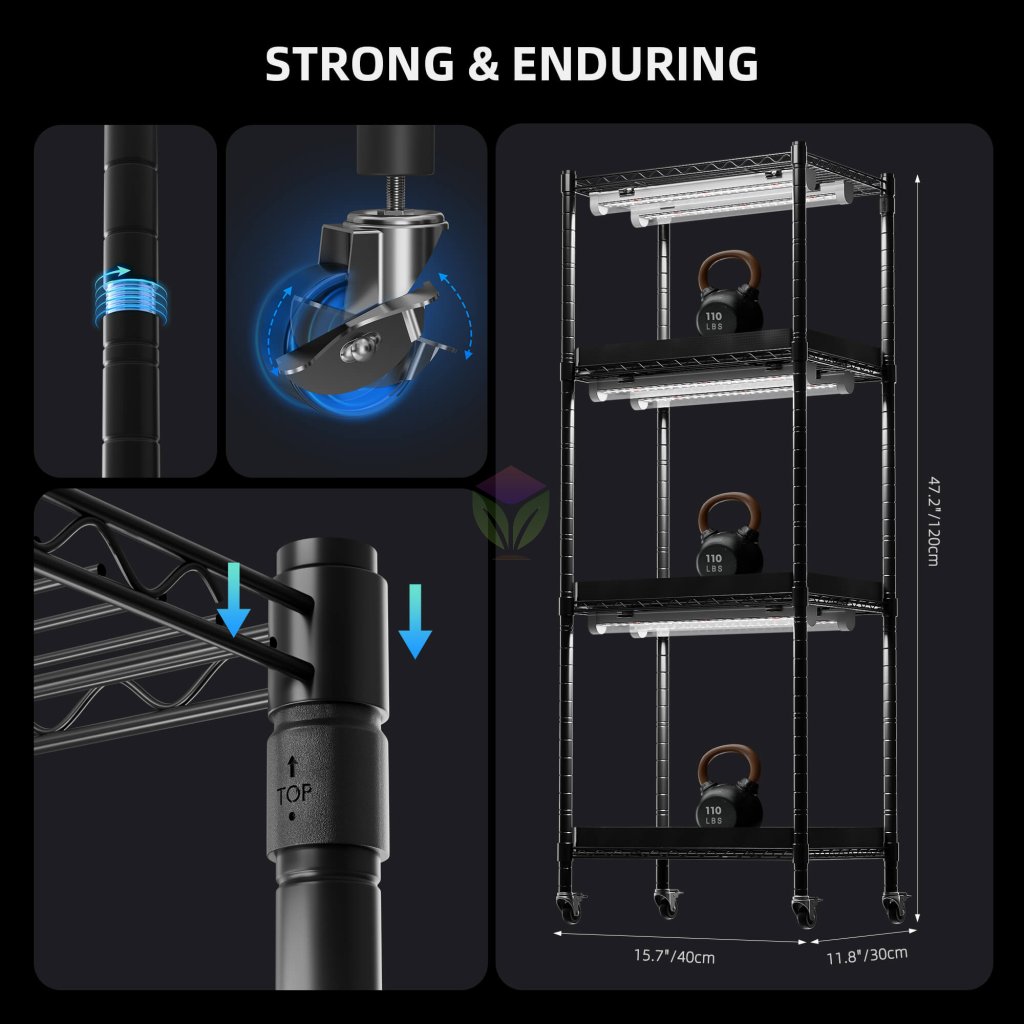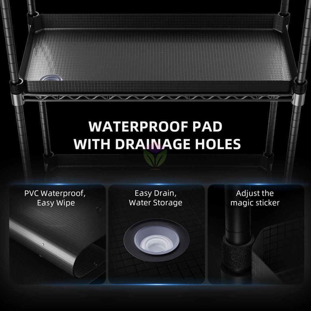 - Kompletní balení – získáte vše, co potřebujete pro úspěšné předpěstování: LED osvětlení, pěstební stojan, drátěné police, vodotěsné podložky a pěstební stan.