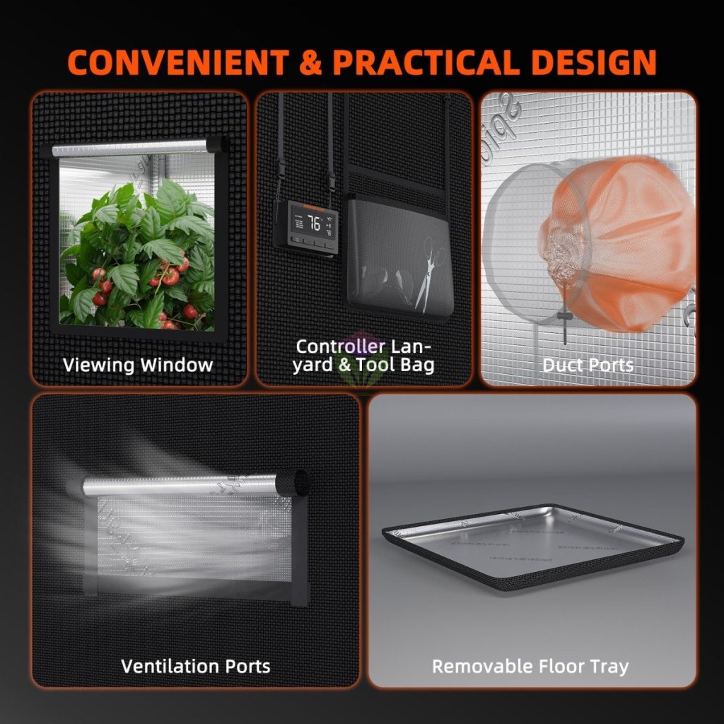 - Dvě pozorovací okna (vnější 30×30 cm, vnitřní 25×25 cm) pro snadnou kontrolu rostlin bez narušení prostředí.