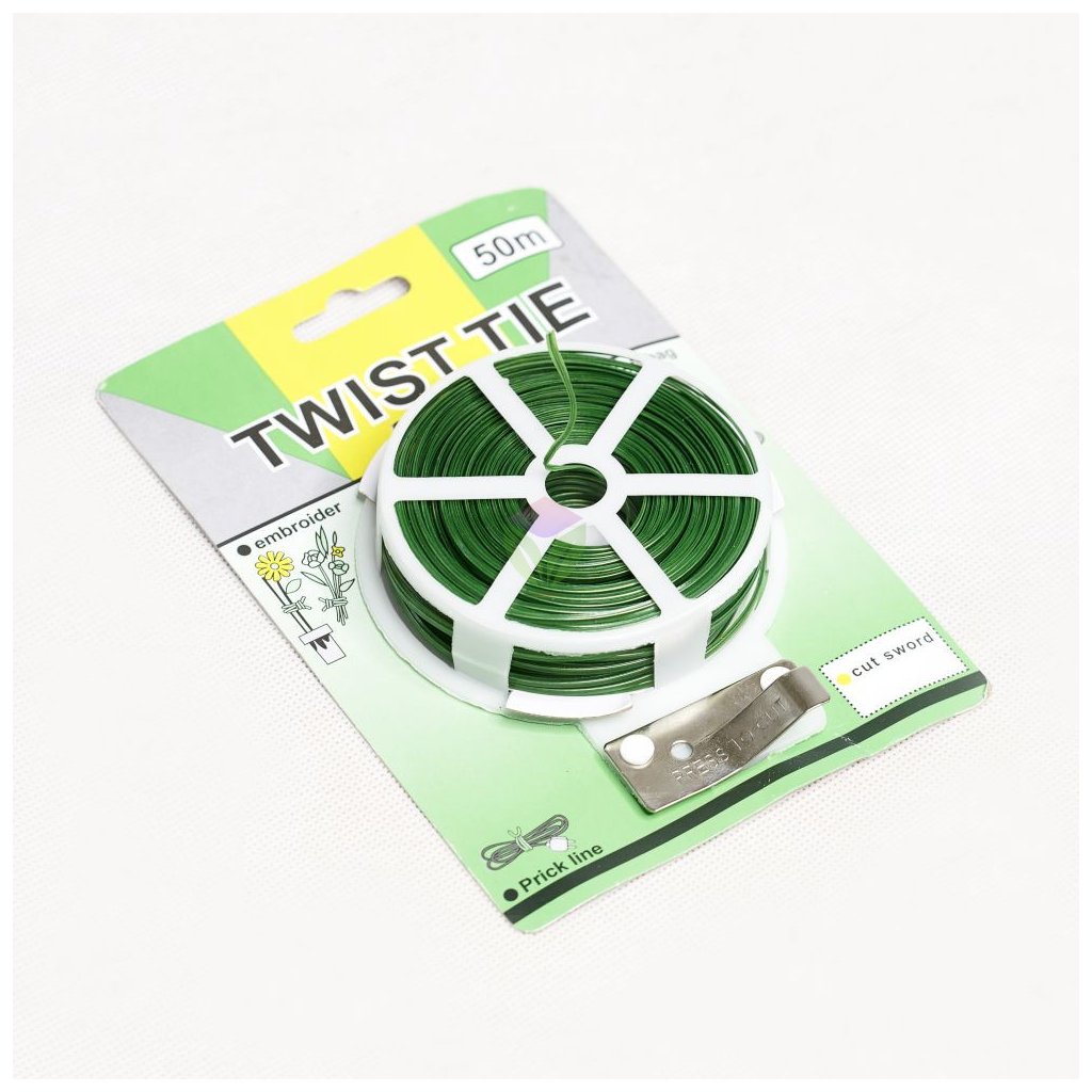 Měkký vázací drát nejen na rostliny. 50 m v jedné roli, včetně kovového zkracovače. Plastový držák lze snadno zavěsit.